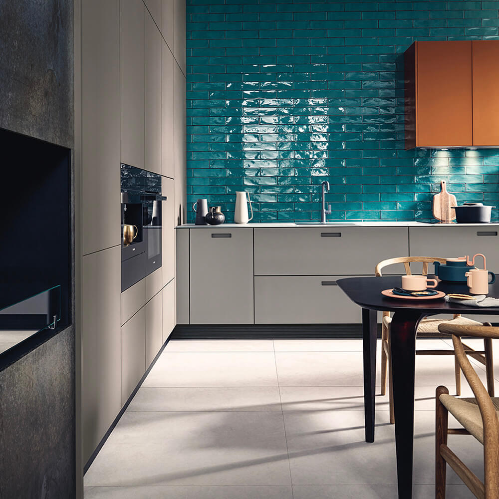 Details machen in der Planung den Unterschied: das offene Regal wechselt sich ab mit geschlossenen Fronten, grifflose Oberflächen stehen im Kontrast zu fein gefrästen Griffmulden, ruhige Farben bilden den nötigen Gegenpol zu kräftigen Tönen wie den cognacfarbigen Schränken und den petrolfarbenen Fliesen, die dem Raum Kraft geben.
